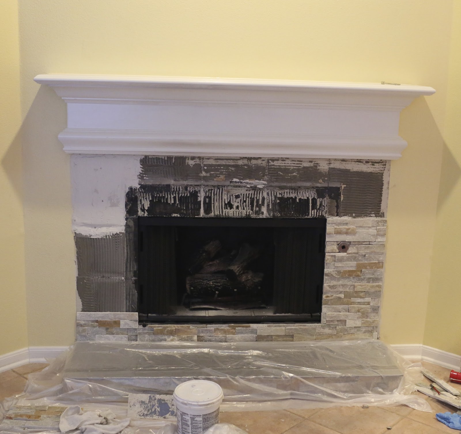 Tile mastic served easy to use and kept the tiles sturdily stuck to the wall. The hearth served to be more of a design challenge. Most of the internet instruction sites utilize preexisting brick hearths in the reface process. We had to build our own using cinderblocks and Quikcrete. Mitte Gray tiles, gray grout, and surrounding ledgestone completed the custom hearth.